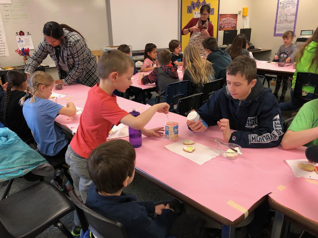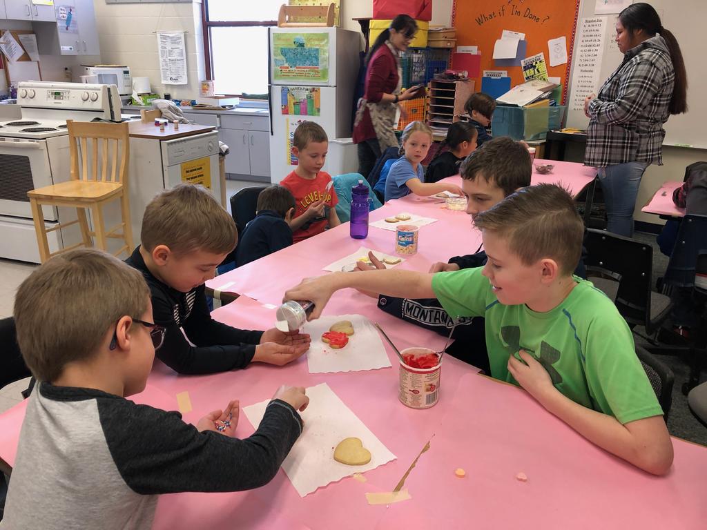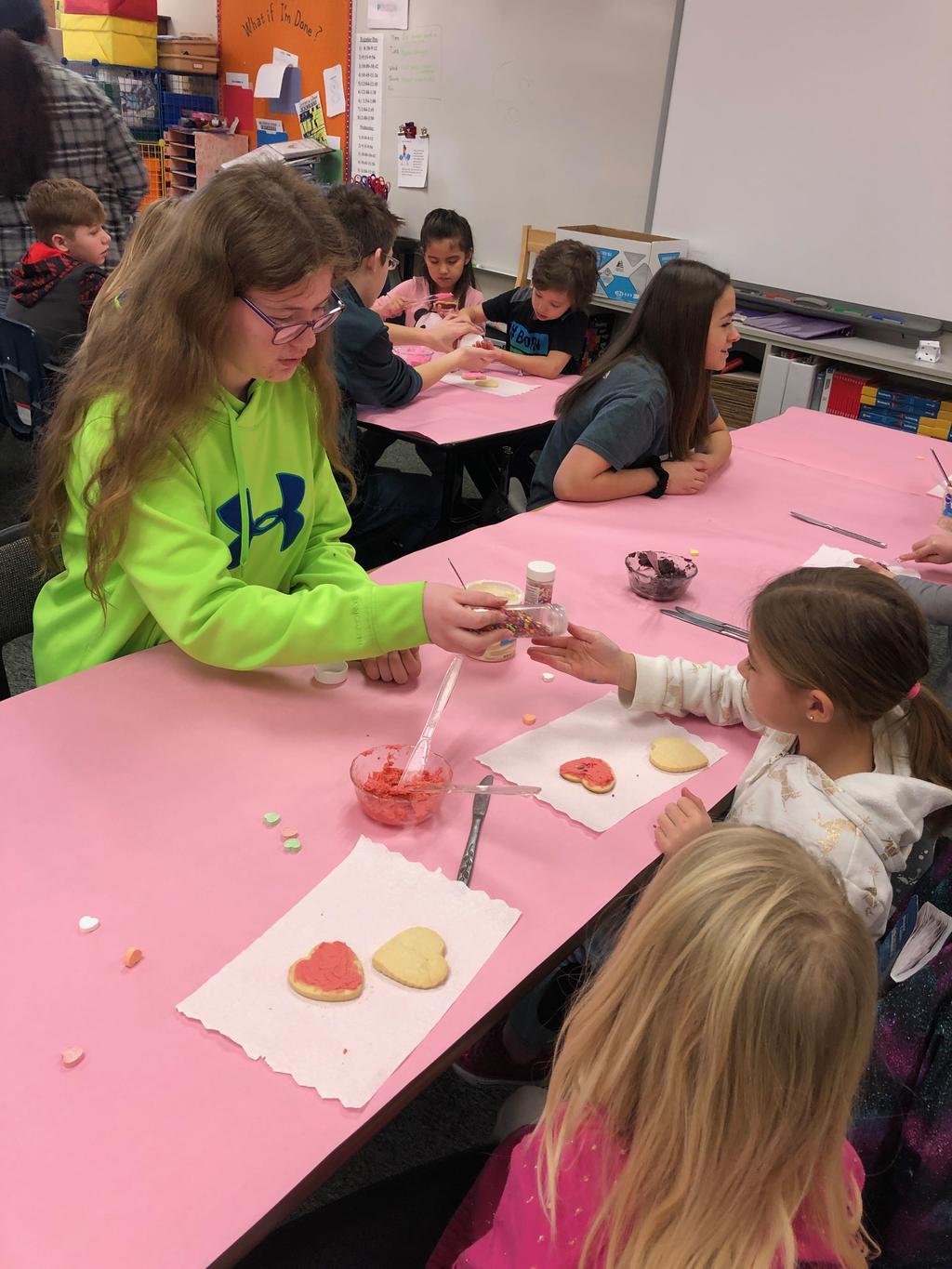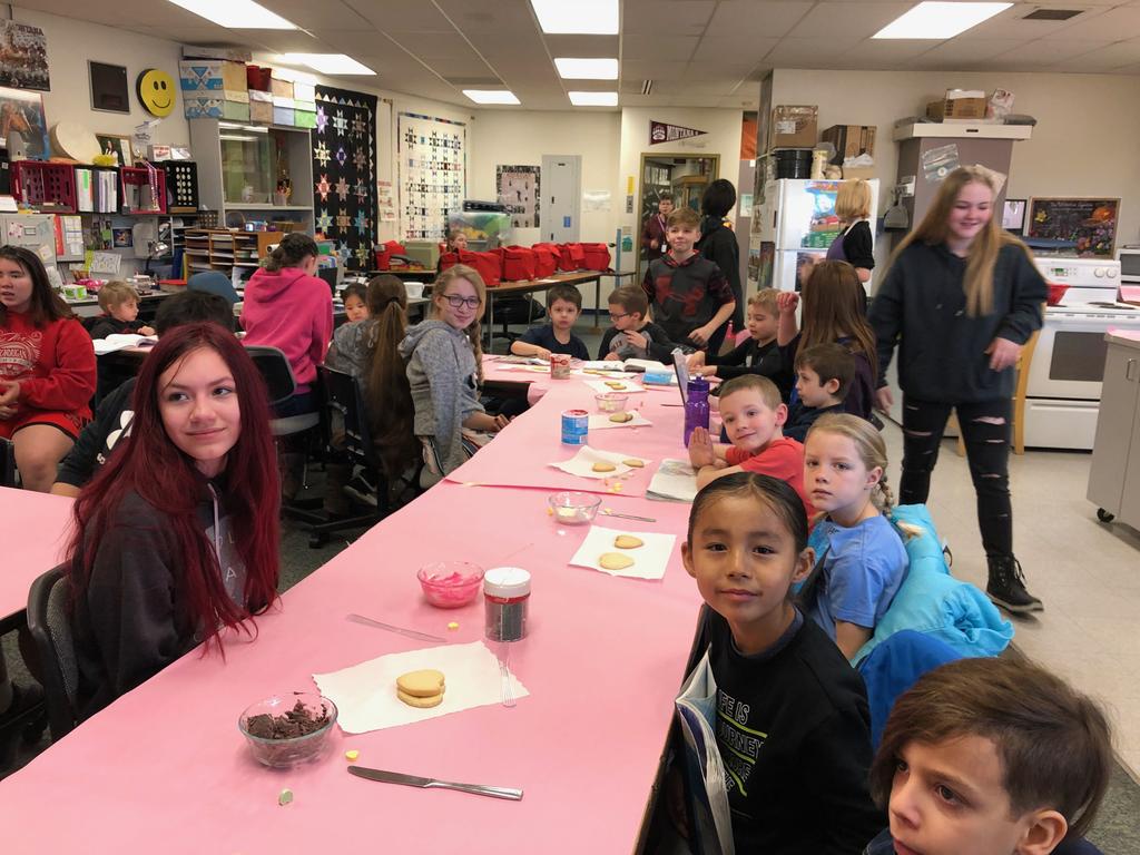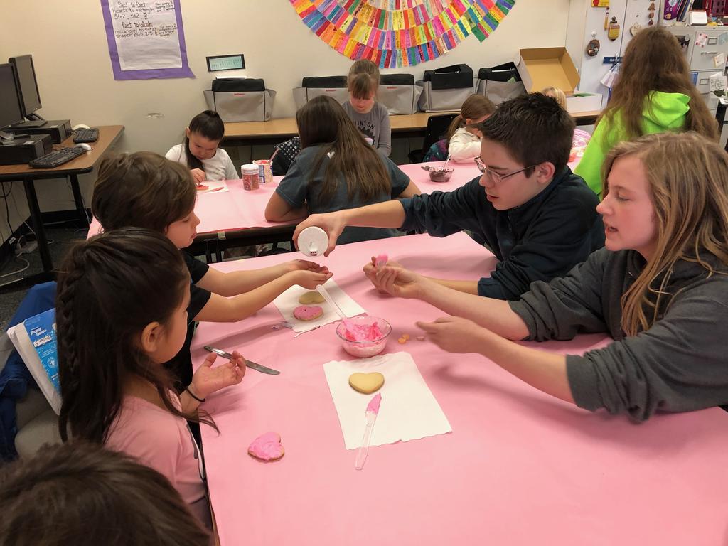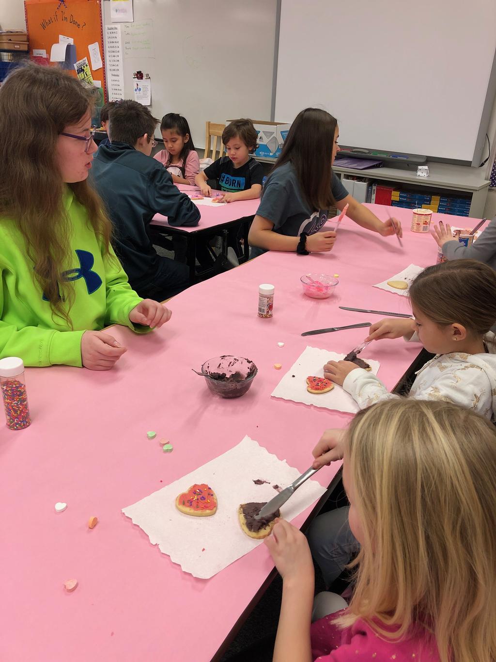Mrs. Crosby's 1st Grade class frosting Valentine cookies with Mrs. Duford's Family and Consumer Science class at PMS