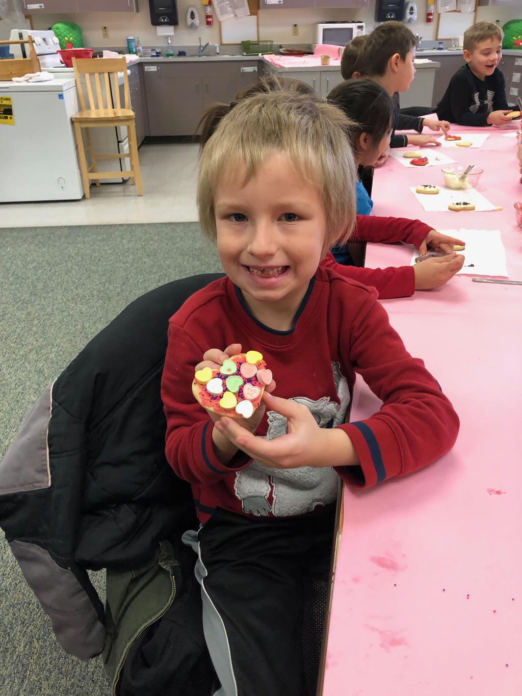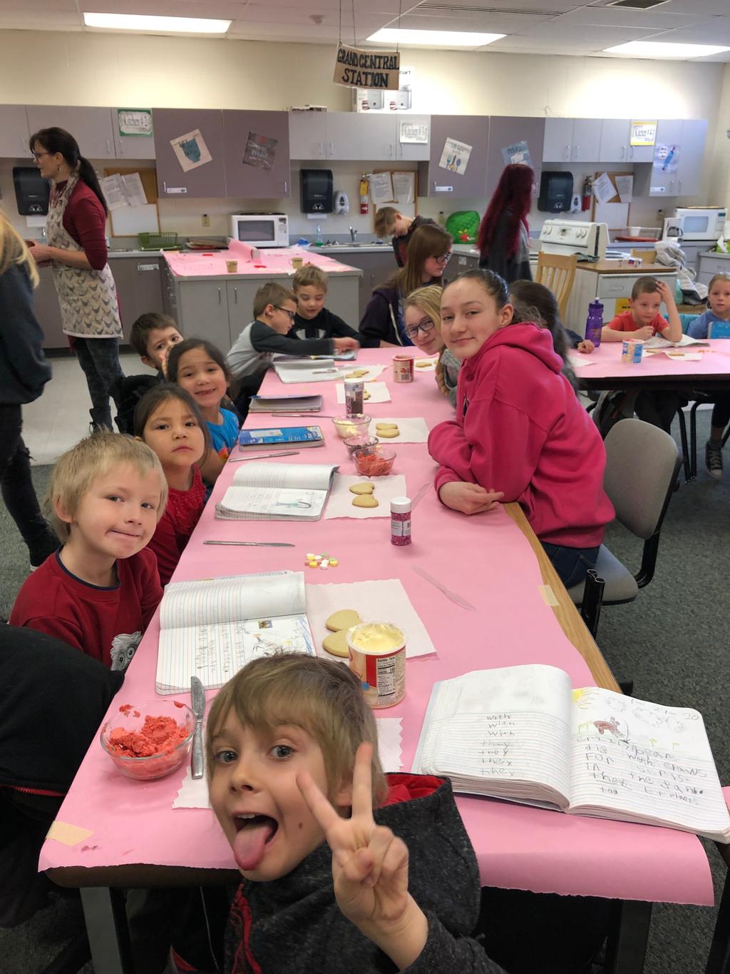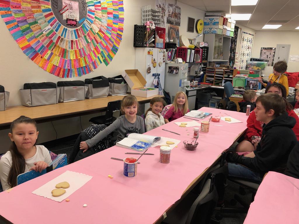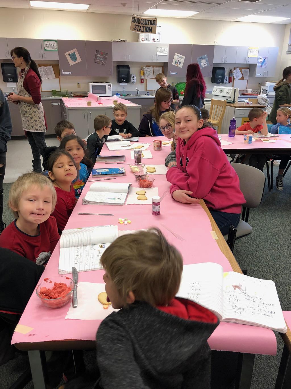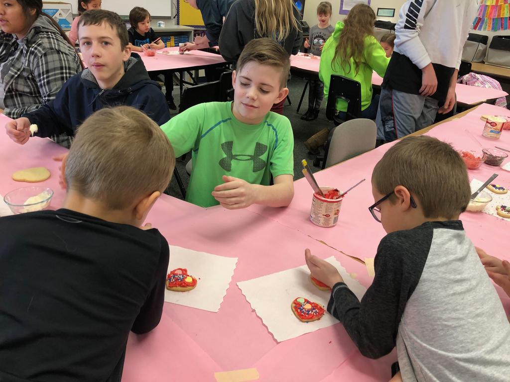 Mrs. Crosby's 1st Grade class frosting Valentine cookies with Mrs. Duford's Family and Consumer Science class at PMS